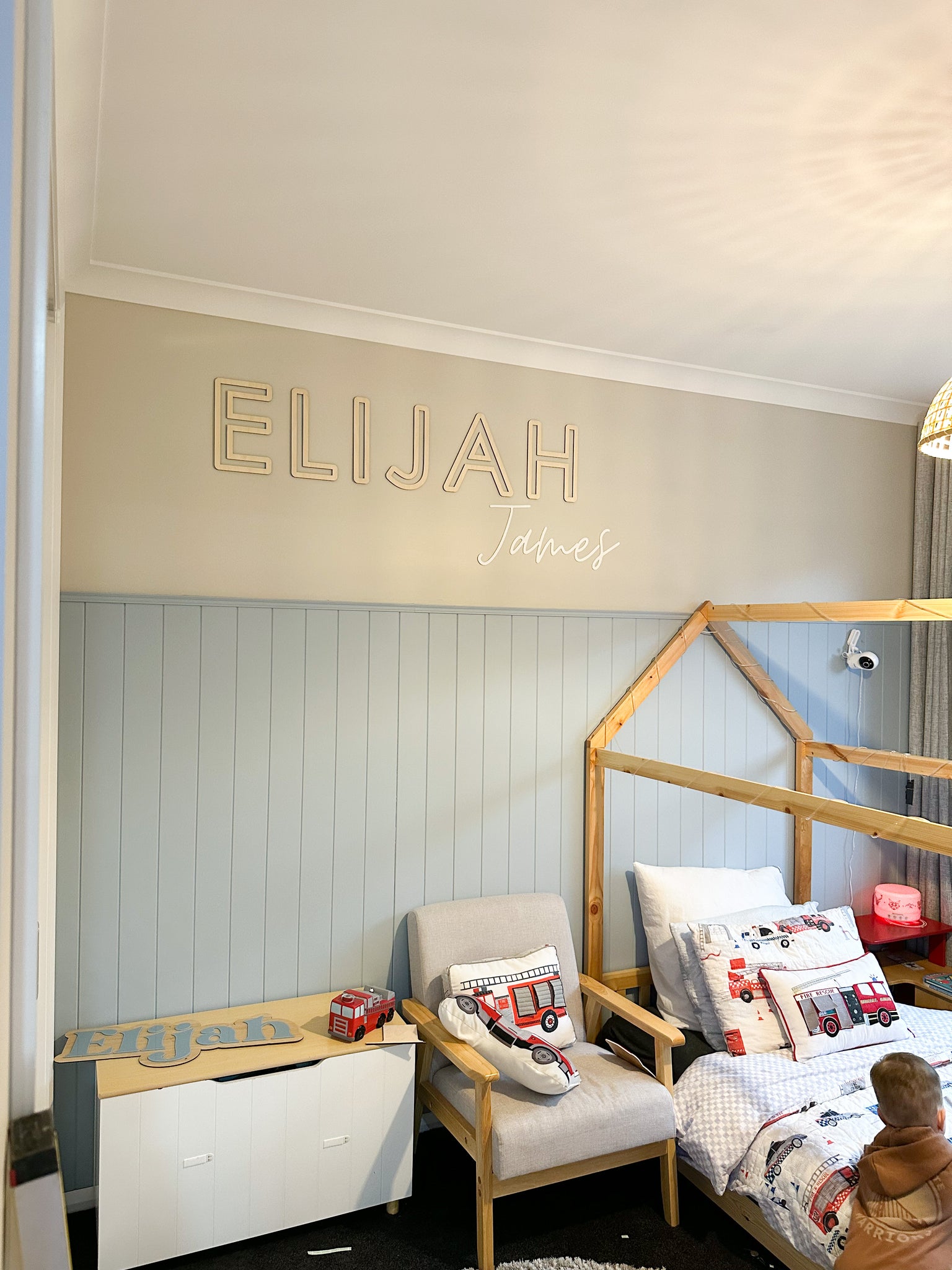 This set will include the first name cut from quality 4mm plywood and the second name in any colour off our colour chart.